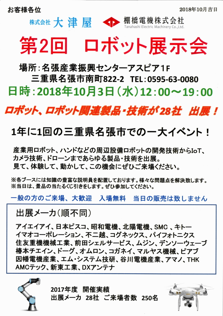2018年10月3日(水)三重県名張市にて、第2回ロボット展示会を開催いたします。